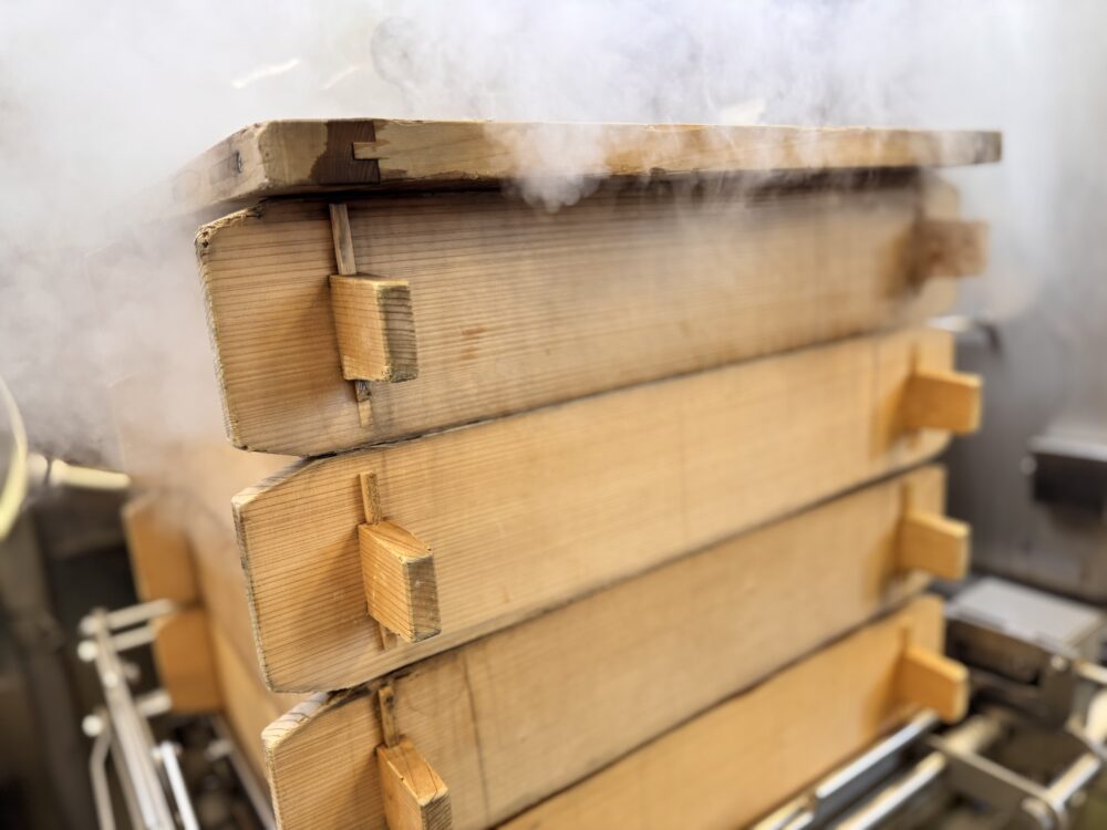 岩船家のお餅は、昔ながらの木製の蒸籠でゆっくり、ふっくらと蒸し上げます。