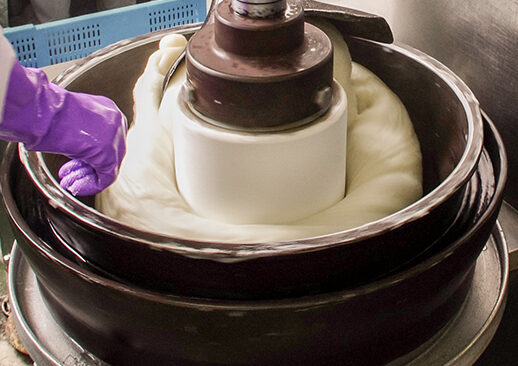 蒸しあがった餅米は杵と臼で丹念につき、しっとりなめらかな食感に仕上げます。