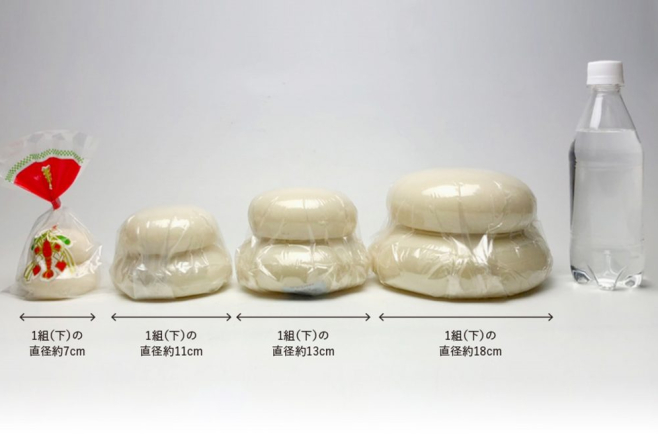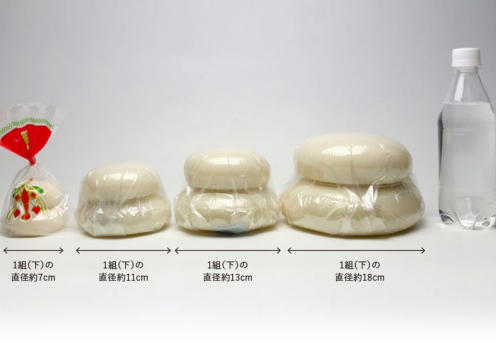 新潟岩船産こがねもちを使用し、一つひとつ職人が手作りで仕上げた鏡餅です。飾り終わった後も美味しく召し上がりいただけます。1升(2㎏)から~3合(600g)まで3種類のサイズと使いやすい大きさの小飾り(180g)の4つのタイプの大きさをご用意しております。