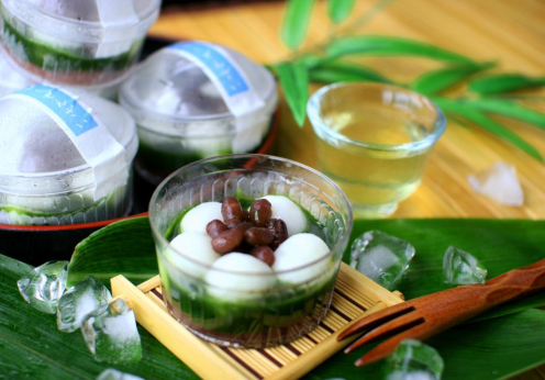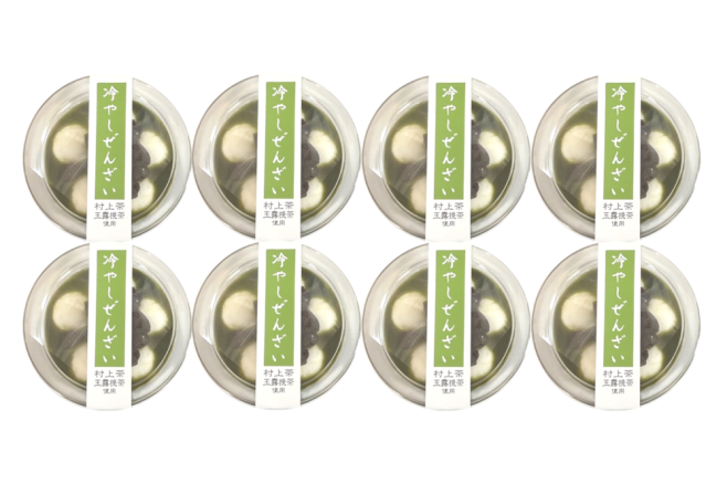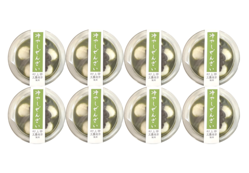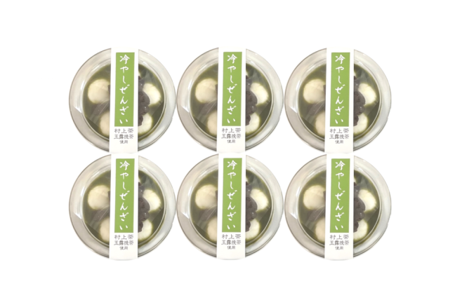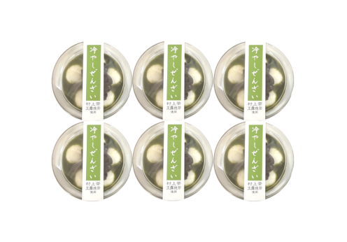 当店の冷やしぜんざいは、モチモチした団子と、「北海道産小豆」を程良い固さに炊き上げた甘さ控えめ『自家製小倉あん』に、当地北限の茶処「村上挽茶(玉露)」を贅沢に使用した『自家製挽茶あん』の「二層あん」が、絶妙な味わいでお楽しみいただけます。